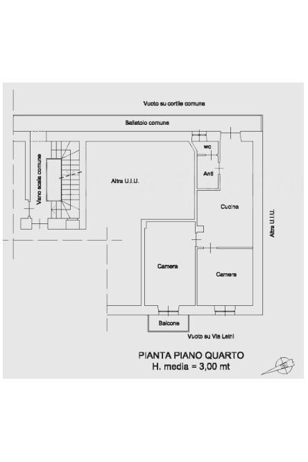 Immobile posto al piano quarto (quinto fuori terra). L'alloggio è composto da: ingresso dal ballatoio, due camere, soggiorno con angolo cottura, bagno e balcone. Al piano interrato cantina di pertinenza.
