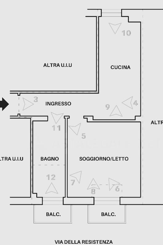 Immobile posto al piano terzo (quarto fuori terra). L'alloggio è composto da: corridoio, stanza, bagno, cucina e due balconi. Al piano interrato cantina di pertinenza.