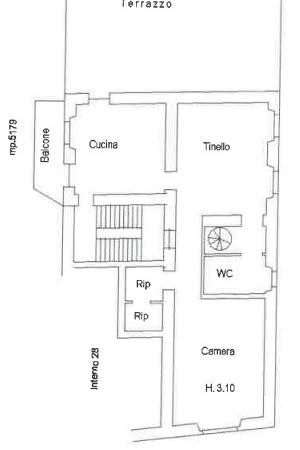 L'immobile è posto al piano secondo (terzo fuori terra). L'alloggio è composto da: ingresso su cucina, tinello, una camera da letto, disimpegno, due ripostigli, un bagno, balcone e un vano accessorio su ampio terrazzo. Porzione di sottotetto raggiungibile da scala a chiocciola interna all'appartamento non di proprietà.