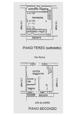 Immobile posto al piano secondo (terzo fuori terra). L'alloggio è composto da: cucina/soggiorno, bagno, camera mansardata e due vani sottotetto non abitabili.