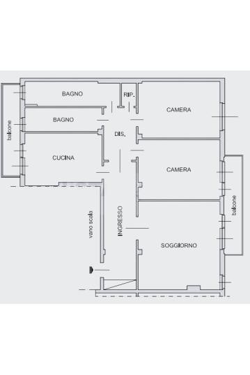 L'immobile è posto al piano secondo (terzo fuori terra). L'alloggio mansardato è composto da: ingresso, disimpegno, soggiorno, cucina, due camere, due bagni, ripostiglio e due balconi. Cantina di pertinenza al piano interrato.