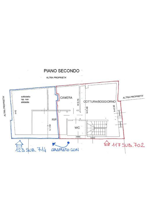 - Piano secondo: soggiorno, cucina, ripostiglio, camera e bagno.
